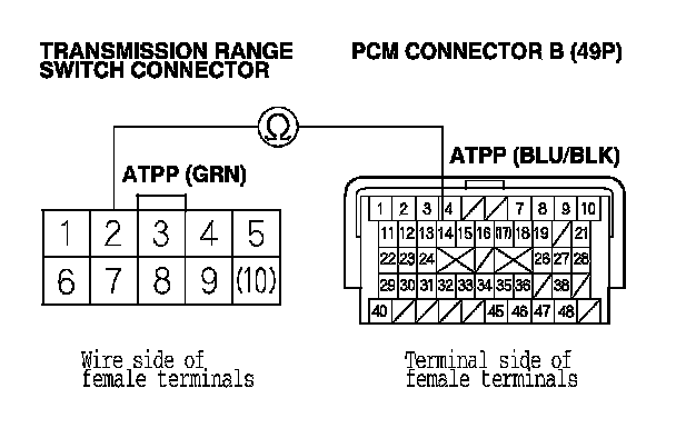 26. Check for continuity between PCM connector terminal B14 and transmission range switch connector terminals No. 2.