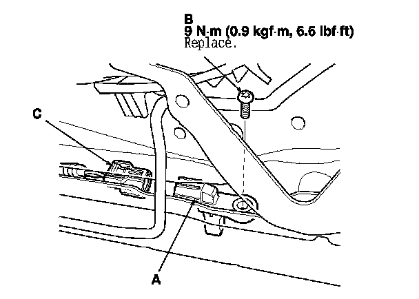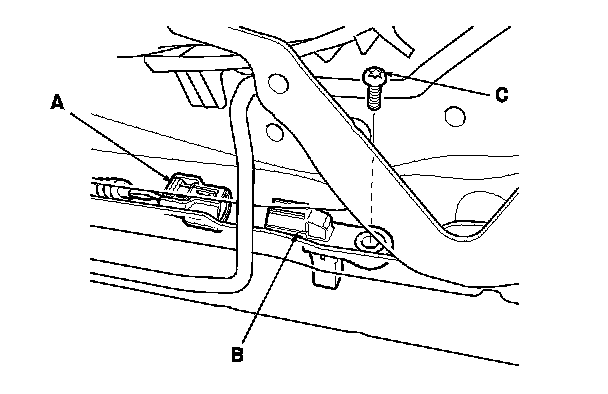 4. Remove the TORX bolt (C) using a TORX T30 bit, then remove the driver's seat position sensor (B) through the space between the seat track and slide as shown.