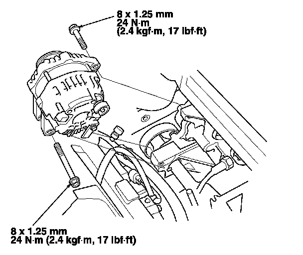 4. Disconnect the alternator connector (A) and BLK wire (B), then remove the harness clamp (C) from the alternator.