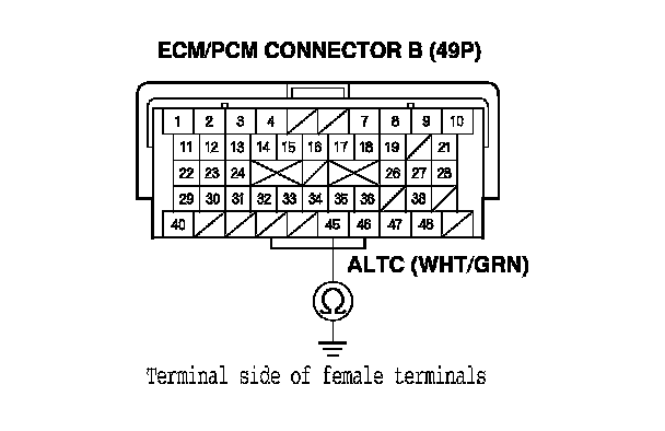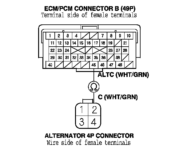 13. Check for continuity between ECM/PCM connector terminal B45 and alternator 4P connector terminal No. 2.