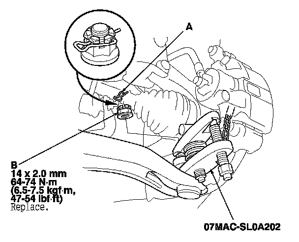 3. Remove the lock pin (A) from the lower arm ball joint, then remove the castle nut (B).
