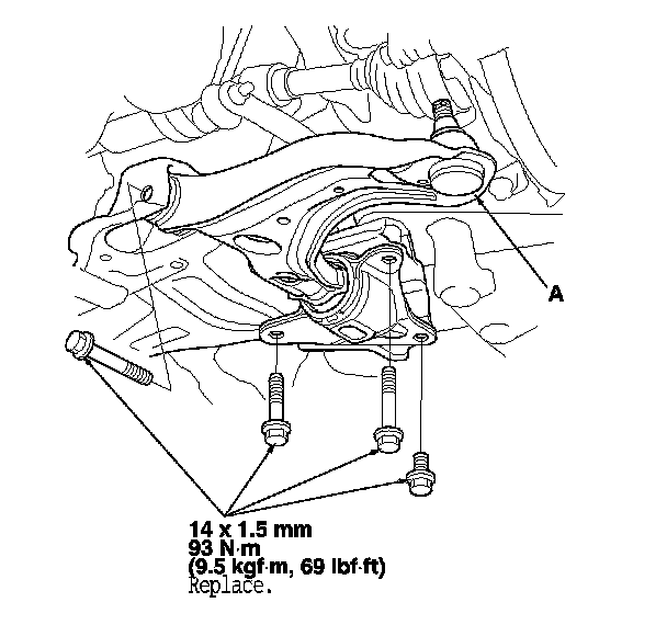 5. Remove the lower arm mounting bolts, then remove the lower arm (A) from the front subframe.