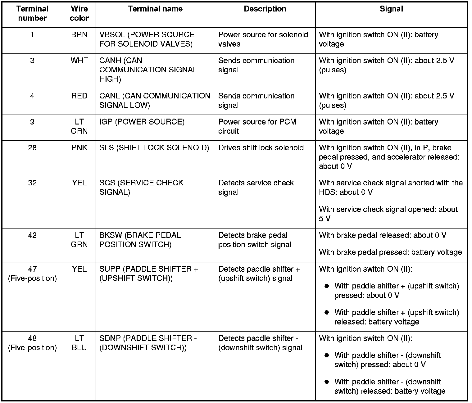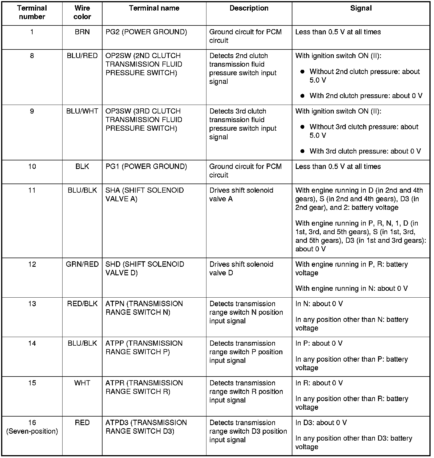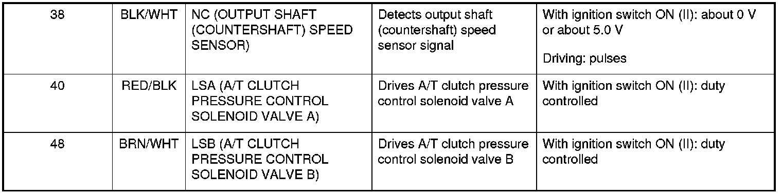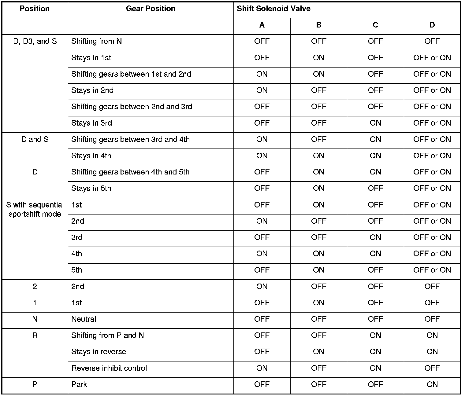 The combination of driving signals to shift solenoid valves A, B, C, and D are shown in the table.