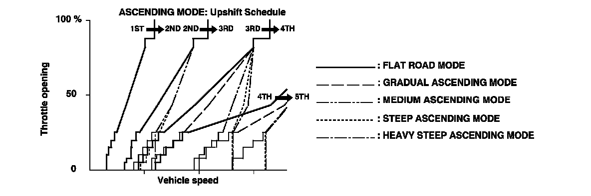 NOTE: Shift commands stored in the PCM between 2nd and 3rd gears, between 3rd and 4th gears, and between 4th and 5th gears, enable the PCM to automatically select the most suitable gear according to the magnitude of a gradient.