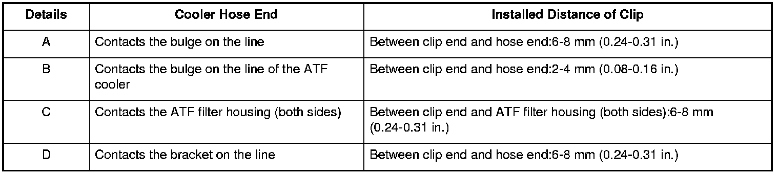 2. Install the ATF cooler hoses over the ATF cooler lines, and secure the hoses with the clips as shown in the details (A) (B) (C) (D), shown in the following figure. Keep the tabs of the clips clear of other parts.