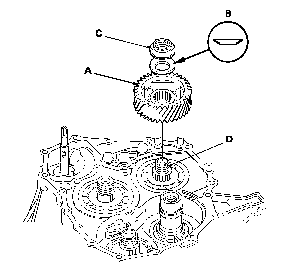 3. Install the mainshaft idler gear (A), the old conical spring washer (B), and the old locknut (C) on the mainshaft (D), and tighten the locknut to 216 N-m (22.0 kgf-m, 159 lbf-ft).
