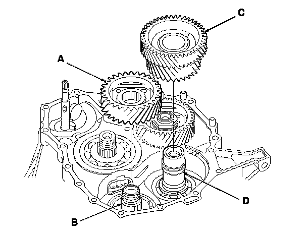 5. Install the secondary shaft idler gear (A) on the secondary shaft (B), and install the idler gear shaft idler gear (C) on the idler gear shaft (D).