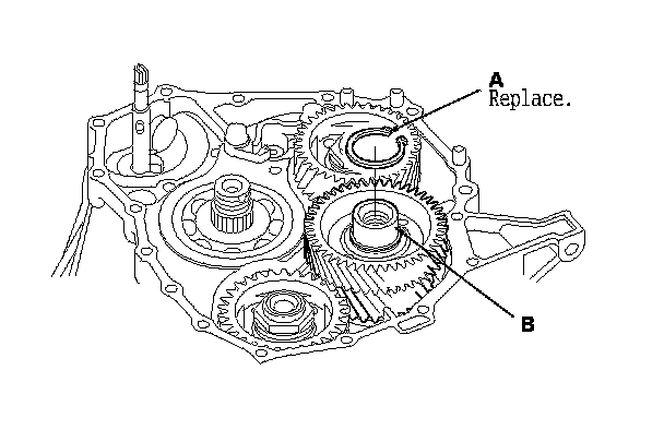 9. Install the new snap ring (A) on the idler gear shaft (B), and verify that the snap ring is seated securely into the groove.