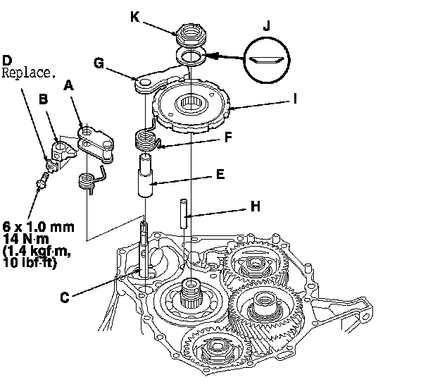 13. Install the park gear (I), the old conical spring washer (J), and the old locknut (K) on the countershaft.