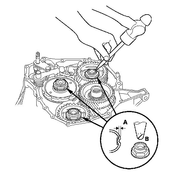 20. Stake the locknuts into the shafts to a depth (A) of 0.7-1.3 mm (0.03-0.05 in.) using a 3.5 mm punch (B).