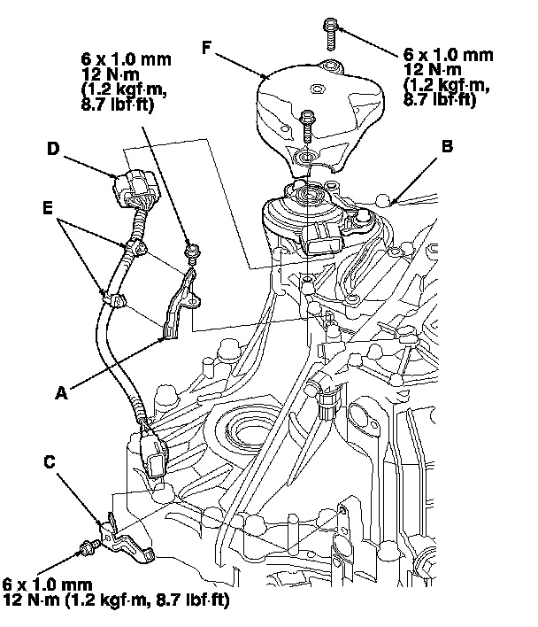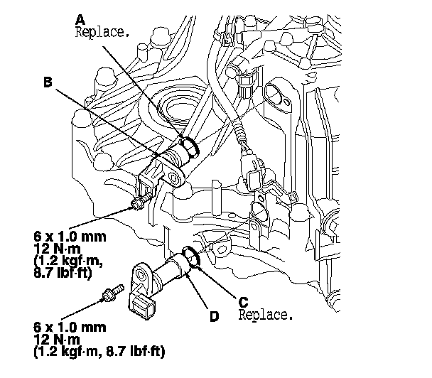 36. Install a new O-ring (C) on the output shaft (countershaft) speed sensor (D), then install the output shaft (countershaft) speed sensor.