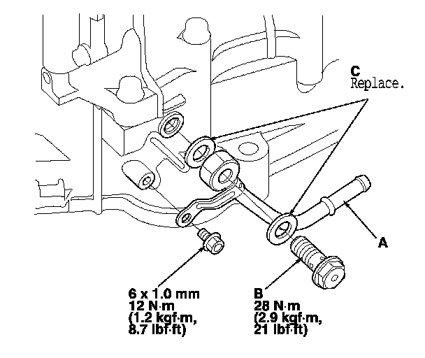 42. Install the ATF outlet line (A) on the torque converter housing, and secure it with the line bolt (B) and new sealing washers (C).