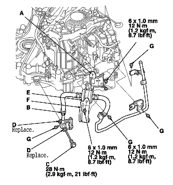 40. Install the ATF pipe (D) and the ATF joint pipes (E), and install the new O-rings (F) over the ATF joint pipes.