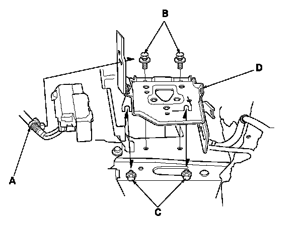 5. M/T model: Remove the harness clamp (A). Remove the two bolts (B) and loosen the two bolts (C), then remove the battery base (D).