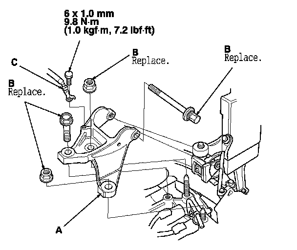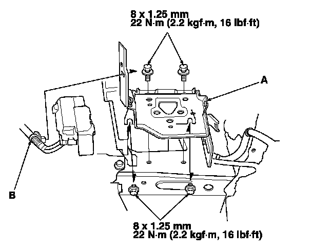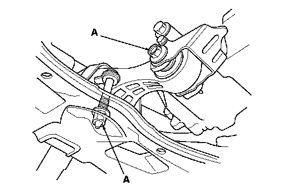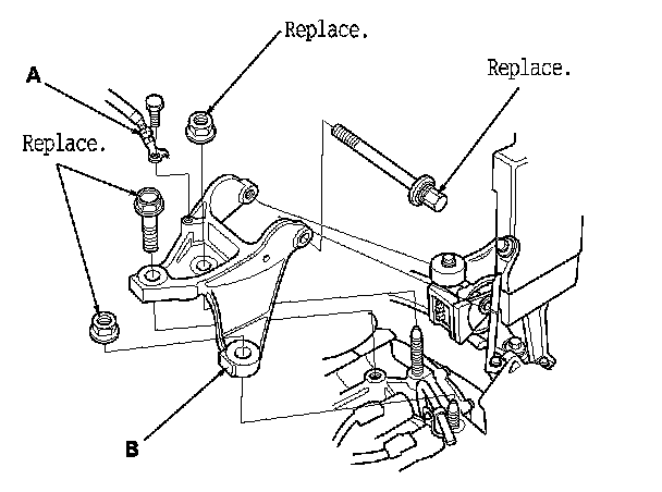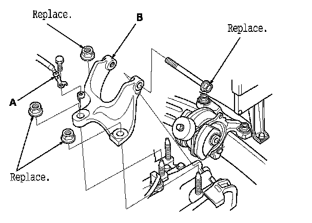 10. Install the transmission mount bracket (A), and loosely tighten the new transmission mount bracket mounting bolts and nuts (B).