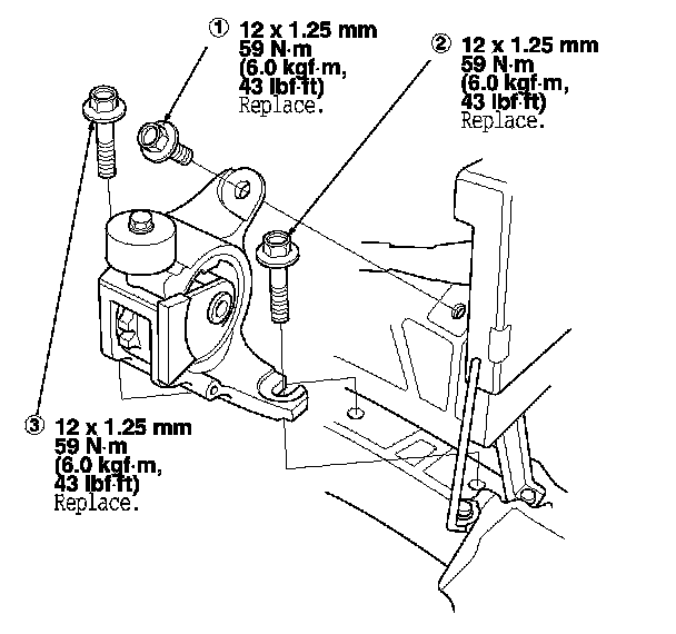 9. Install the transmission mount and loosely tighten the new transmission mount mounting bolts, then tighten the transmission mount mounting bolts in the numbered sequence shown.