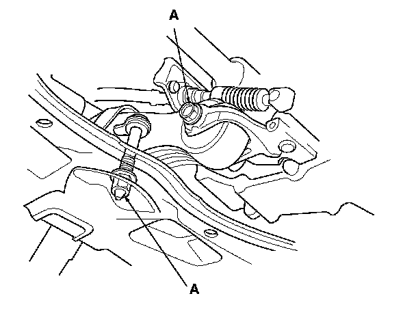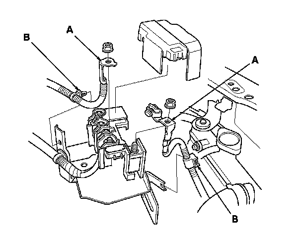 7. Remove the ground cable (A), then remove the transmission mount bracket (B).