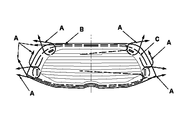 6. With a helper on the outside, pull the piano wire (A) back and forth in a sawing motion. Hold the piano wire as close to the rear window (B) as possible to prevent damage to the tailgate, and carefully cut through the adhesive (C) around the entire rear window.