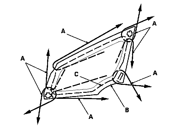 5. With a helper on the outside, pull the piano wire (A) back and forth in a sawing motion. Hold the piano wire as close to the front corner glass (B) as possible to prevent damage to the body, and carefully cut through the adhesive (C) around the entire front corner glass.