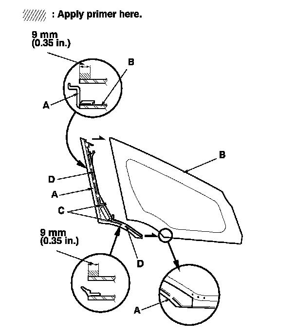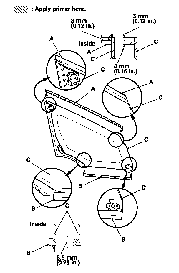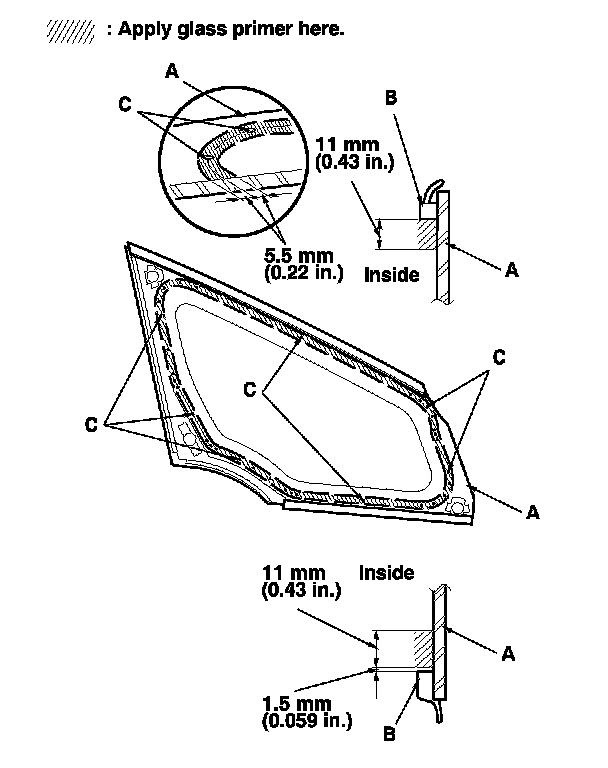 - Apply the glass primer to the front and rear portions of the front corner glass, using the printed dots (C) on the front corner glass as a guide.
