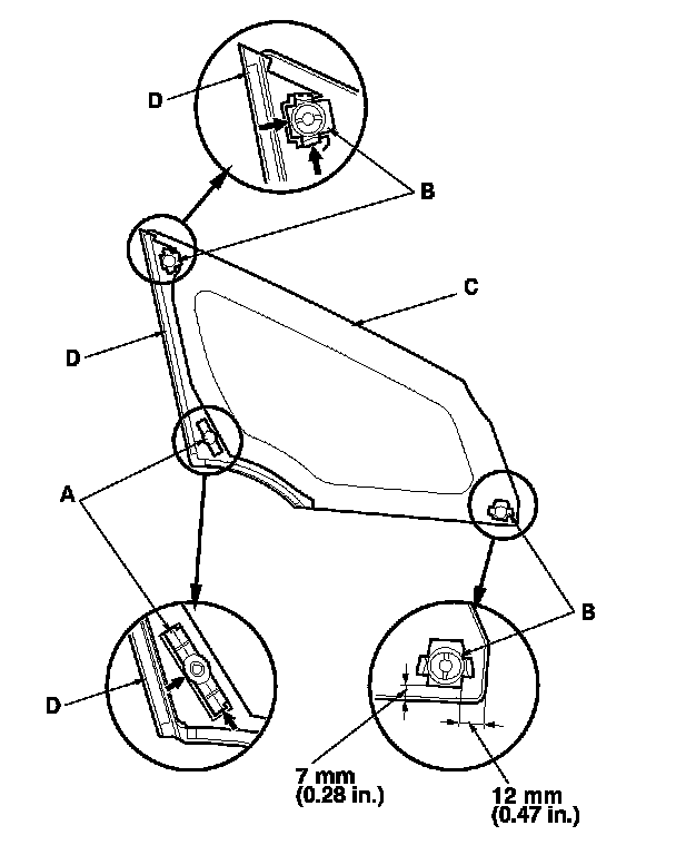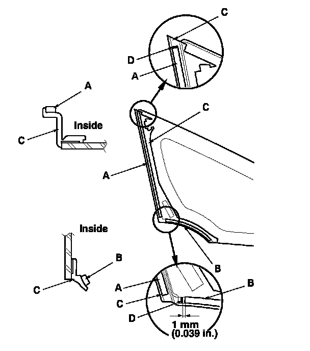 11. Attach seals A and B to the inside face of the quarter glass trim (C). Be sure the top edges of the seals line up with the alignment lines (D) on the trim as shown.