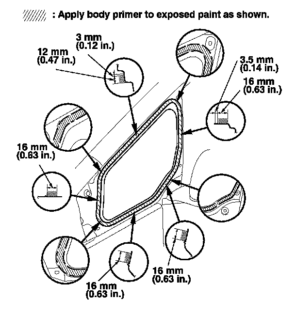 15. Apply a light coat of body primer to any exposed paint or metal around the front corner glass mounting flange. Let the body primer dry for at least 10 minutes: