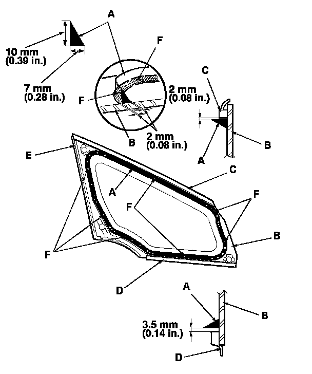 Apply the adhesive to the front and rear portions of the front corner glass, using the printed dots (F) on the front corner glass as a guide.