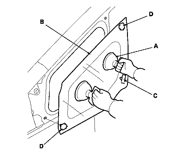 - Make sure the upper corner of the upper of clips B contacts the inner shape of the front corner trim (D).