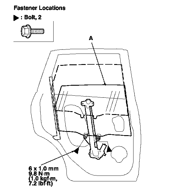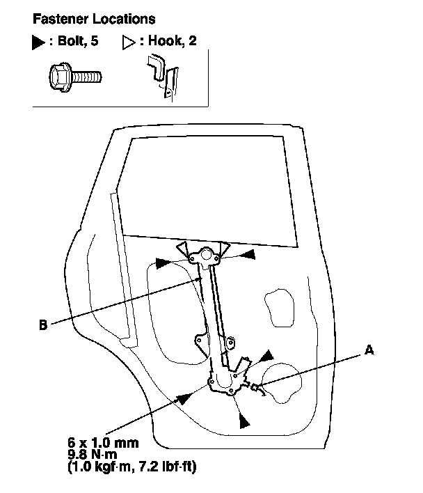 10. Remove the bolts, pull the regulator up to release the hooks, then remove the regulator through the hole in the door.