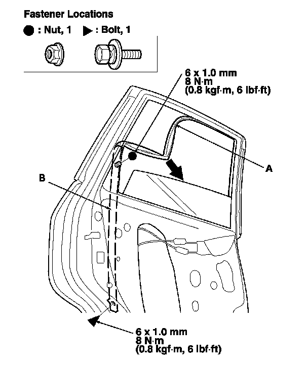 5. Pull the glass run channel (A) away as needed. Loosen the nut, and remove the bolt securing the rear lower channel (B).