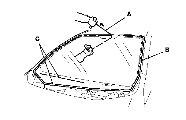 Carefully cut through the rubber dam and adhesive (C) around the entire windshield.