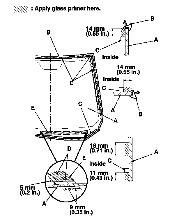 - Apply glass primer to the bottom (E) of the windshield, using the printed dots (D) on the windshield as a guide.