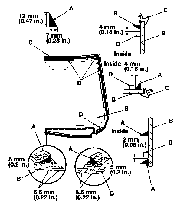 19. Put the cartridge in a caulking gun, and run a continuous bead of adhesive (A) on the windshield (B) along the edge of the molding (C) and rubber dams (D) as shown. Apply the adhesive within 30 minutes after applying the glass primer. Make a slightly thicker bead at each corner.