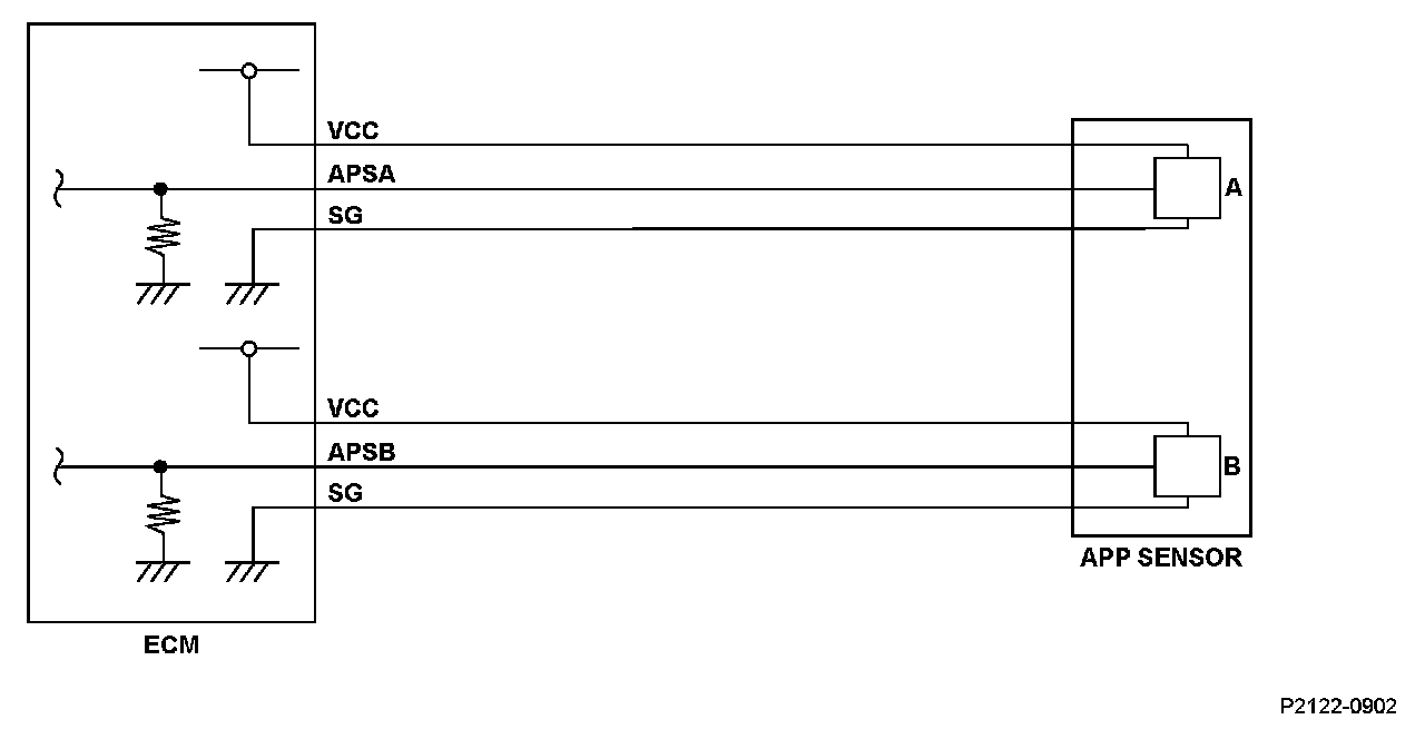 Accelerator pedal position (APP) sensor A is a part of the electronic throttle control system (ETCS). It is used to convert the position of the accelerator pedal into electrical signals. Based on these signals, the engine control module (PCM) controls the throttle actuator so that the throttle position agrees with the accelerator pedal position. If the signal voltage from APP sensor A is a set value or more, the ECM detects a malfunction and stores a DTC.