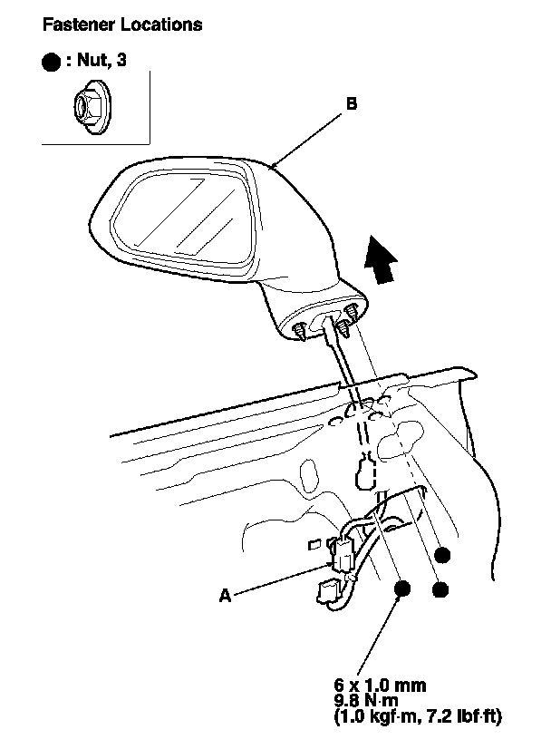 NOTE: To avoid scratching the door, be sure to hold the mirror while removing or installing the nuts.
