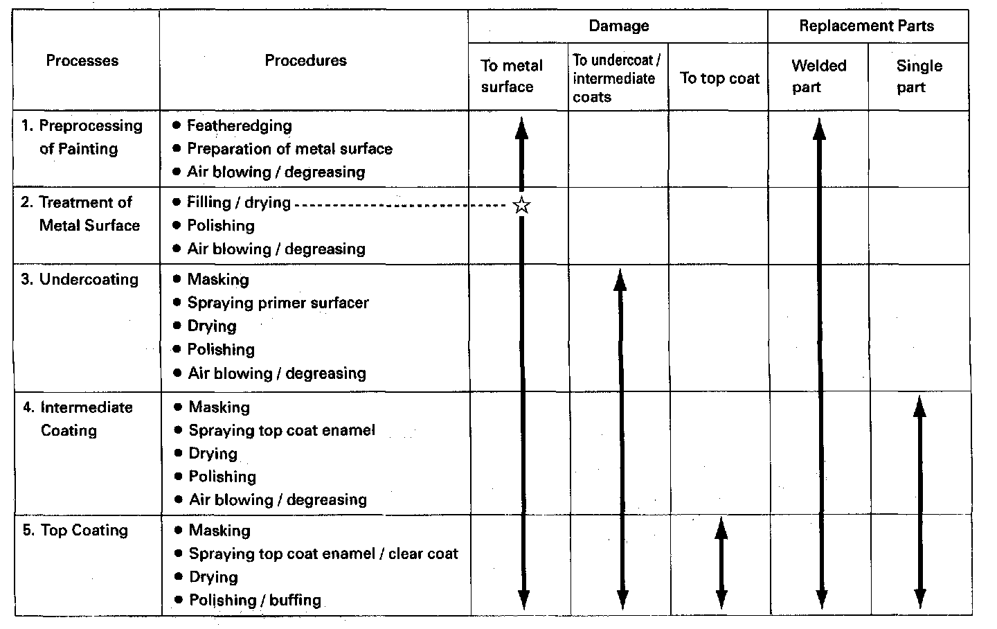 Paint damage can appear in any form. Before making a repair, check the damaged area carefully, and determine the best procedure for repairing the damage. The illustration shows you refinishing methods for various types of paint damage or defects.