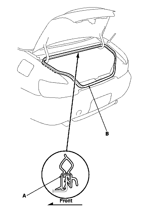2. Locate the painted alignment mark (A) on the trunk lid weatherstrip (B). Align the painted mark with the alignment tab in the center of the trunk, and install the weatherstrip all the way around facing in the direction shown. Make sure there are no wrinkles in the weatherstrip.
