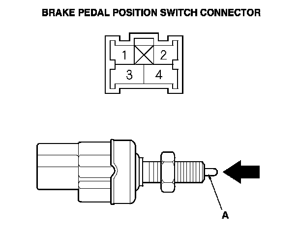 2. Check for continuity between terminals No. 1 and No. 2 of the brake pedal position switch connector. There should be continuity when the button (A) is pressed, and no continuity when the button is released.