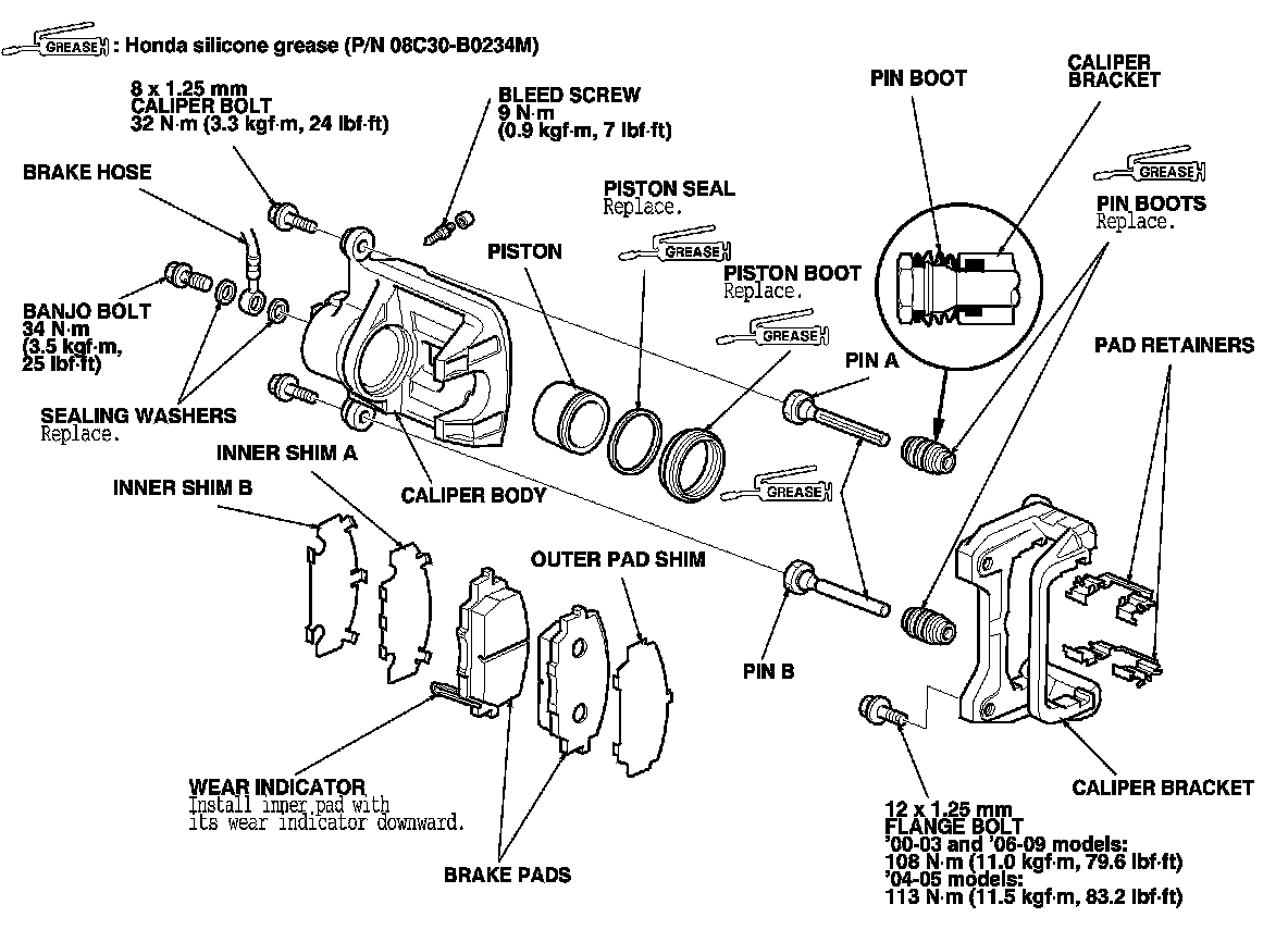 NOTE: Make sure that the caliper pins are installed correctly. Upper caliper pin A and lower caliper pin B are different. If these caliper pins are installed in the wrong location, it will cause vibration, uneven or rapid pad wear, and possibly uneven tire wear.