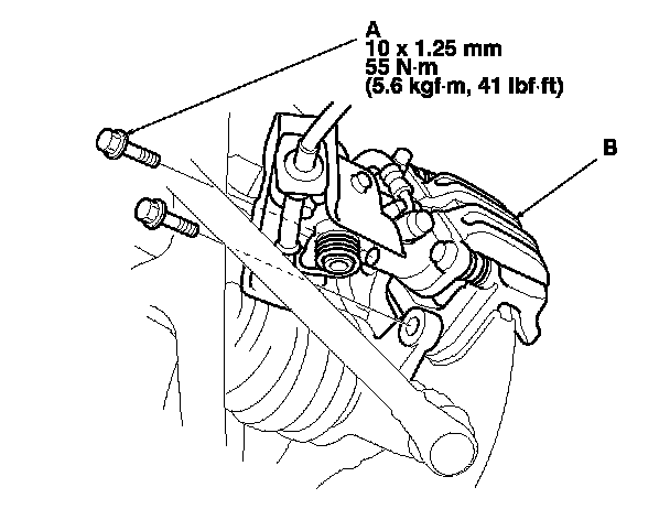 4. Remove the brake caliper bracket mounting bolts (A), then remove the caliper assembly (B) from the knuckle. To prevent damage to the caliper assembly or brake hose, use a short piece of wire to hang the caliper assembly from the undercarriage. Do not twist the brake hose and the parking brake cable excessively.