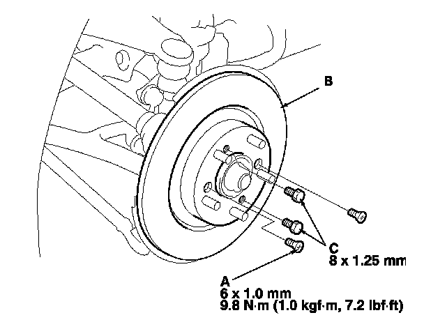 NOTE: If the brake disc is stuck to the rear hub, thread two 8 x 1.25 mm bolts (C) into the brake disc to push it away from the rear hub. Turn each bolt 90 degrees at a time to prevent the brake disc from binding.