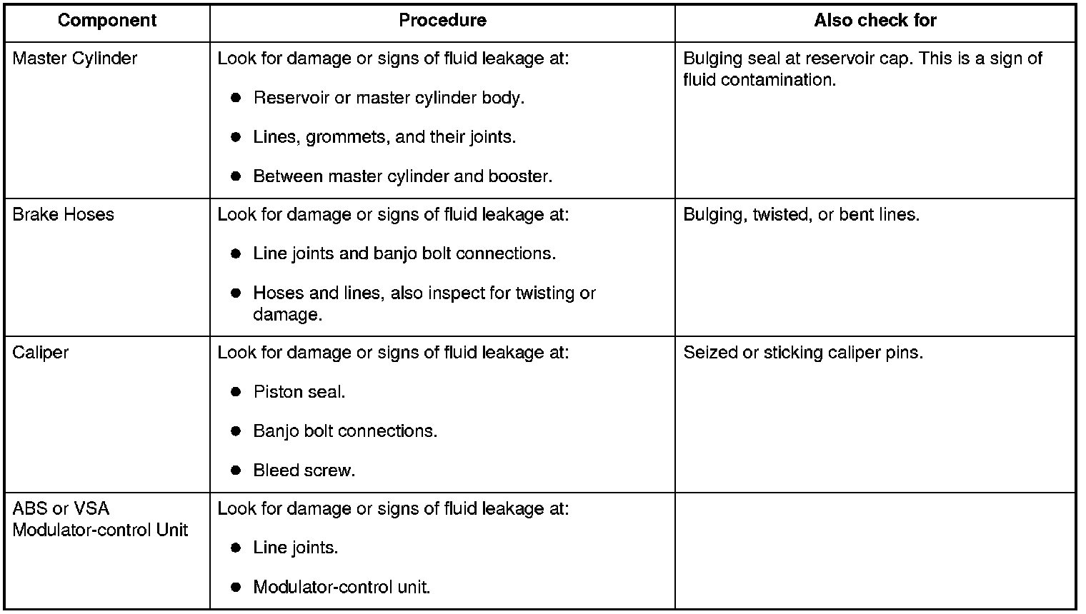 Inspect the brake system components listed. Repair or replace any parts that are leaking or damaged.