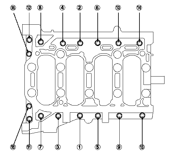 16. Apply new engine oil to the threads of the bearing cap bolts. Tighten the bearing cap bolts is sequence to 29 N-m (3.0 kgf-m, 22 lbf-ft).