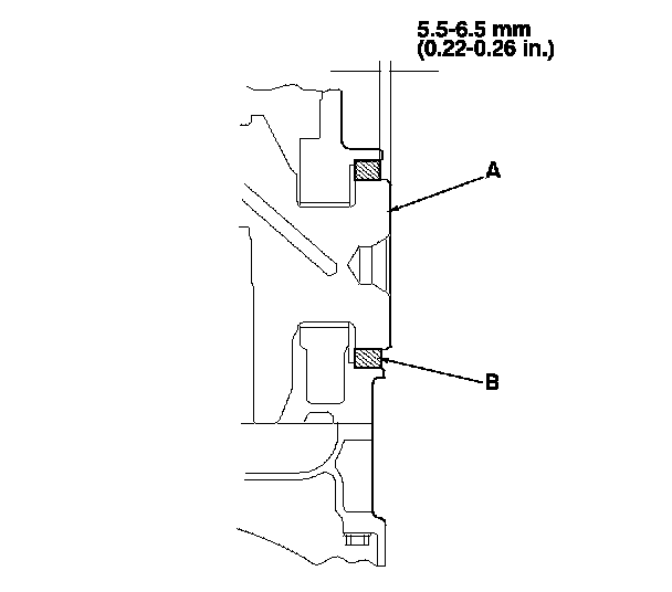 22. Measure the distance between the crankshaft (A) and the crankshaft oil seal (B).
