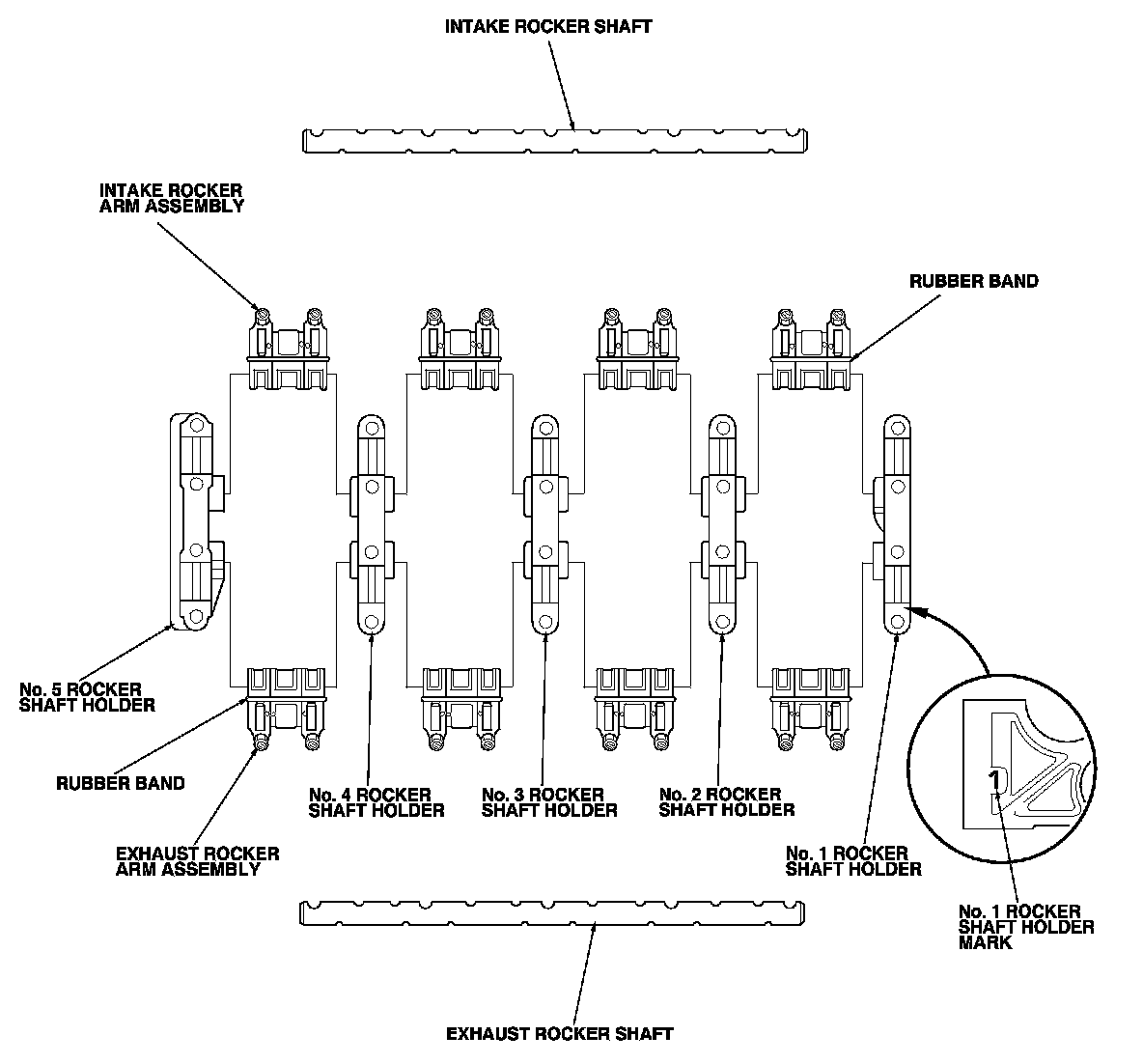 - When removing or installing the rocker arm assembly, do not remove the mounting bolts. The bolts will keep the rocker shaft holder.
