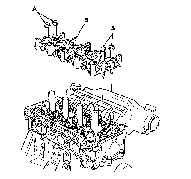 2. Insert the bolts (A) into the rocker shaft holder, then install the rocker arm assembly (B).