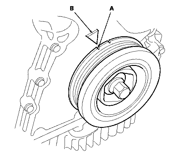 1. Make sure the crankshaft pulley is at top dead center (TDC). Align the TDC mark (A) on the crankshaft pulley with the pointer (B) on the chain case.