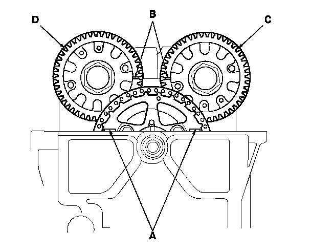 4. Align the TDC marks (B) on the intake camshaft gear (C) and the exhaust camshaft gear (D), and install the camshafts.