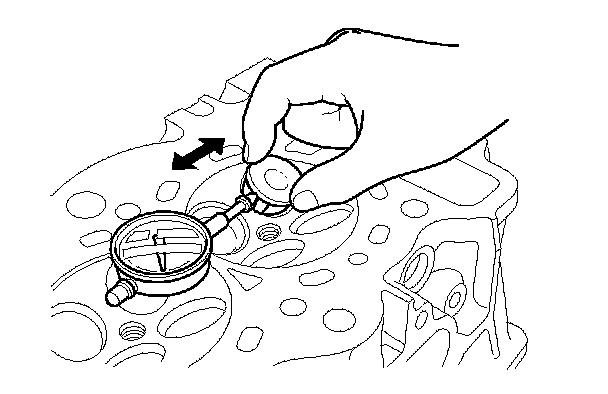 2. Slide the valve out of its guide about 10 mm (0.39 in.), then measure the stem-to-guide clearance with a dial indicator while rocking the stem in the direction of normal thrust (wobble method).