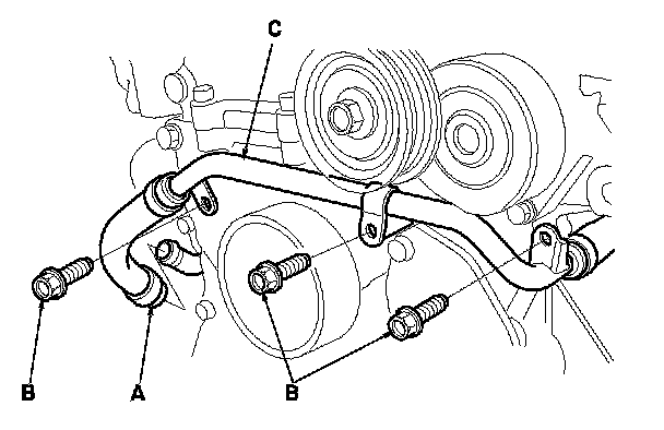 9. Disconnect the water bypass hose (A), then remove the three bolts (B) securing the water bypass tube (C).